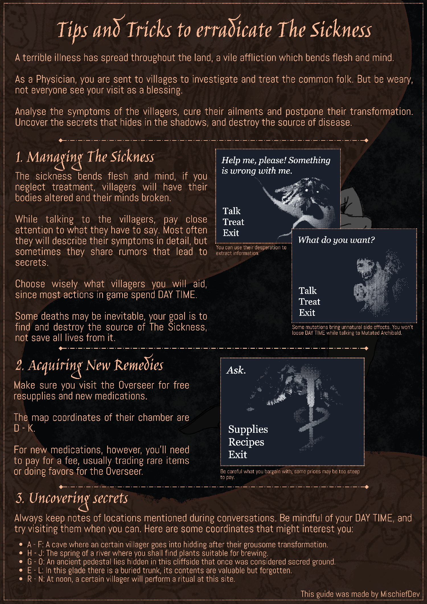 As a Physician, you are sent to villages to treat the common folk and erradicate the source of the sickness. But be weary, not everyone see your visit as a blessing.